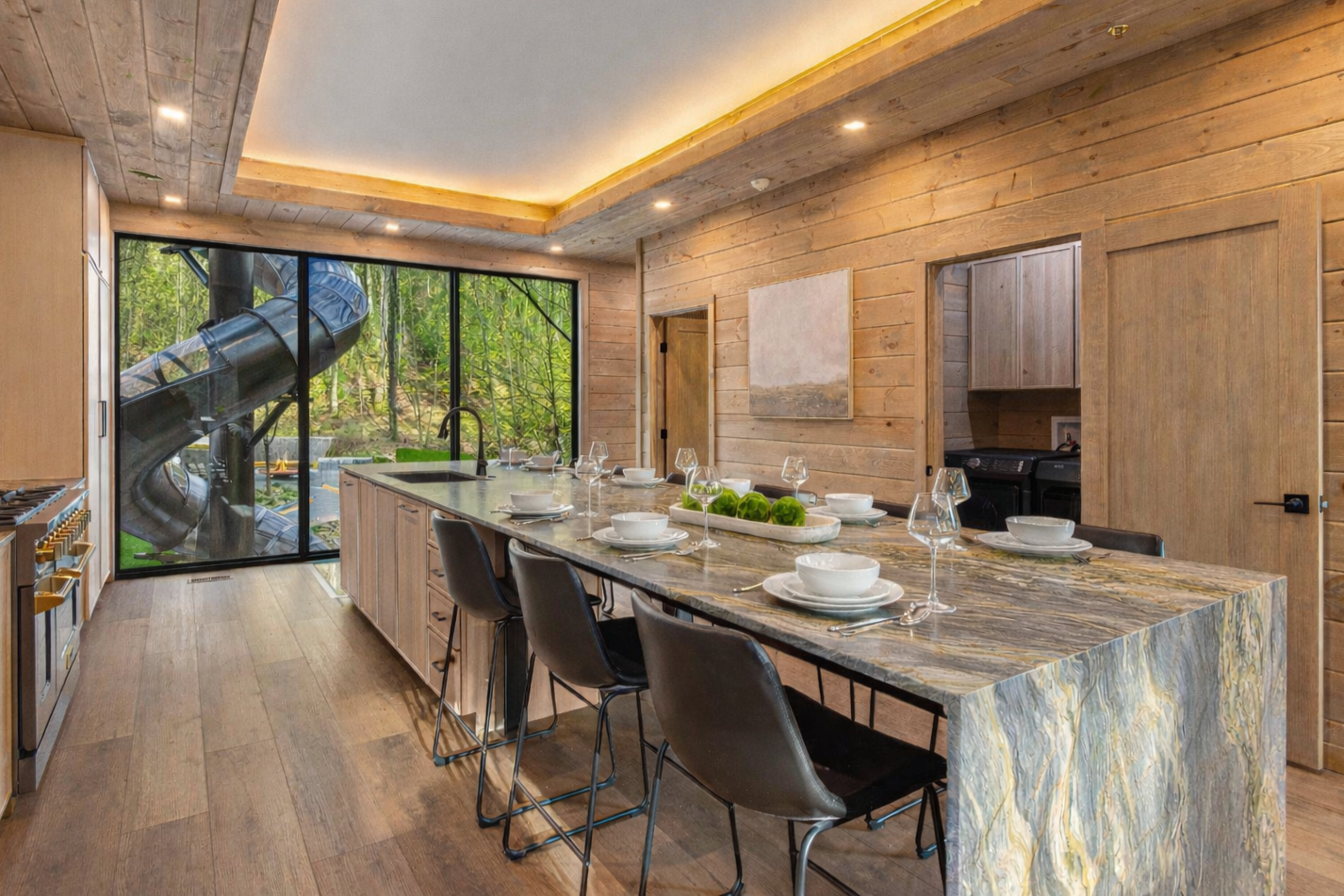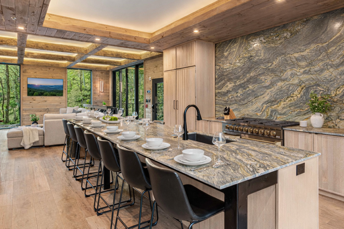The kitchen is the heart of the home, featuring a 48-inch, eight-burner stainless steel range and all the cookware needed for everything from leisurely breakfasts to group dinners. A waterfall stone island with seating for 10 flows into the forest-view living room—an open, stylish space made for entertaining, relaxing, and savoring the moment.