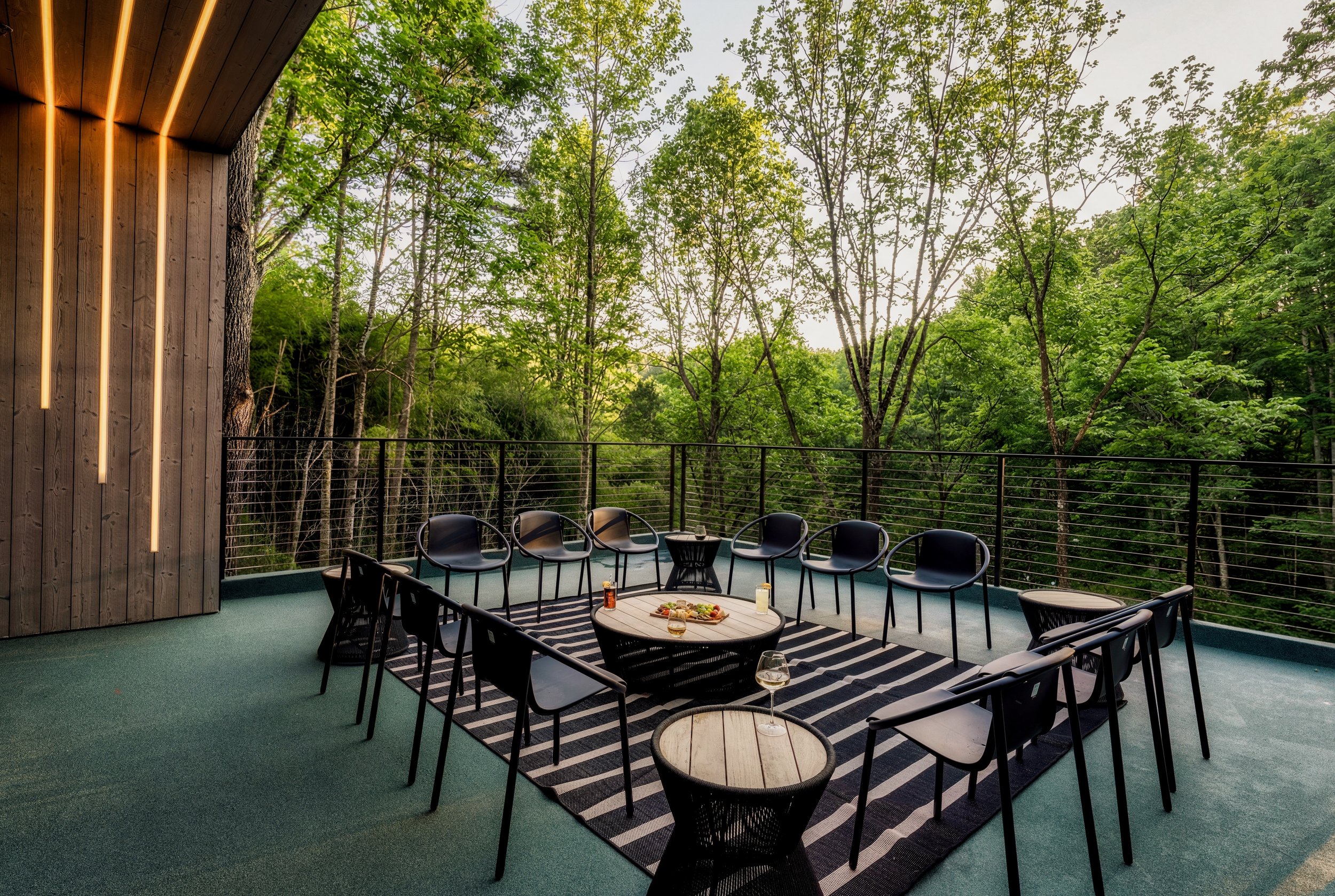 The main-level wraparound deck offers sweeping forest views. Toast the day with wine and charcuterie in hand, surrounded by the tranquil beauty of the Smoky Mountains.