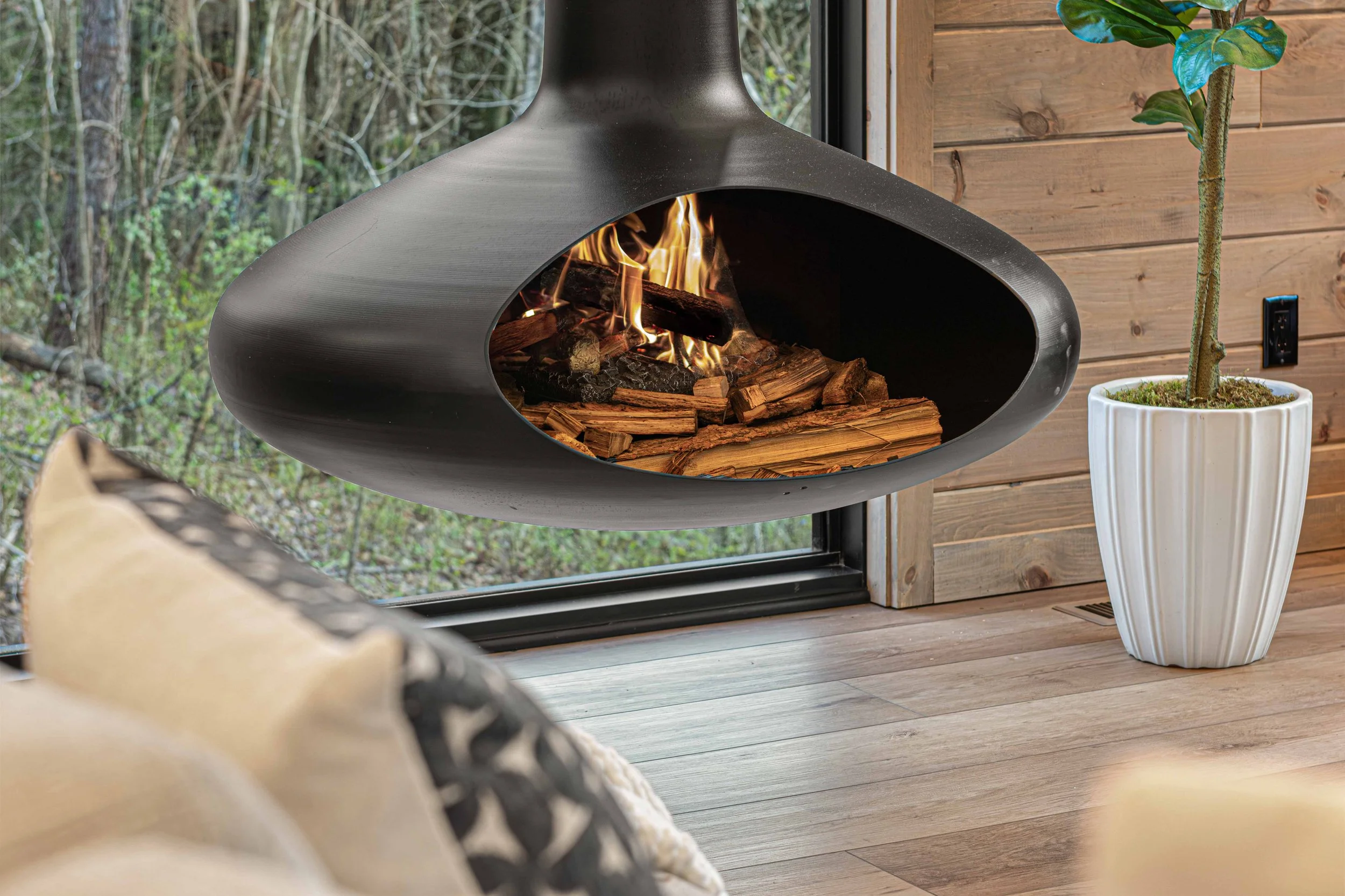 Sink into cozy seating in the family room as the forest outside meets modern luxury inside. Unwind as the floating electric fireplace casts a cozy glow, creating a stunning treetop sanctuary. Plush sofas and floor-to-ceiling windows create a cozy, sunlit woodland escape.