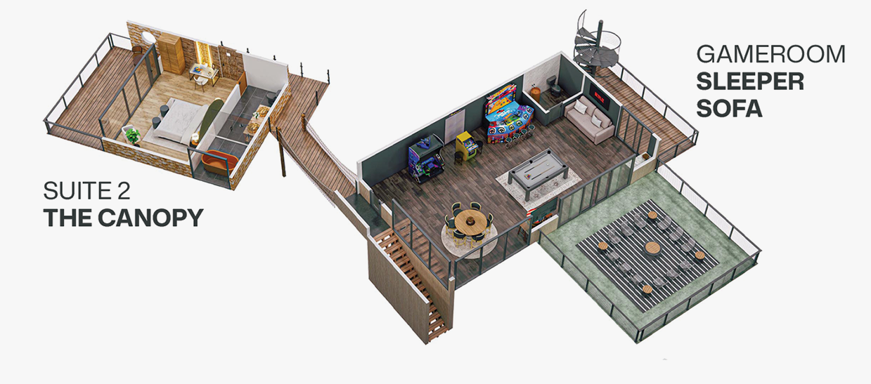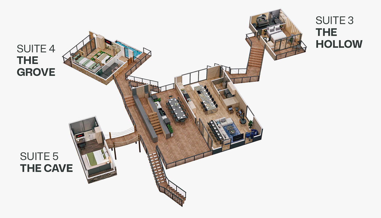 Five masterfully crafted suites. Linked by a network of suspension bridges and sky-walkways, these elevated retreats redefine mountain luxury. Five sanctuaries. Five private baths. One sublime forest escape. The choice is yours. Where will your Hideout story begin?