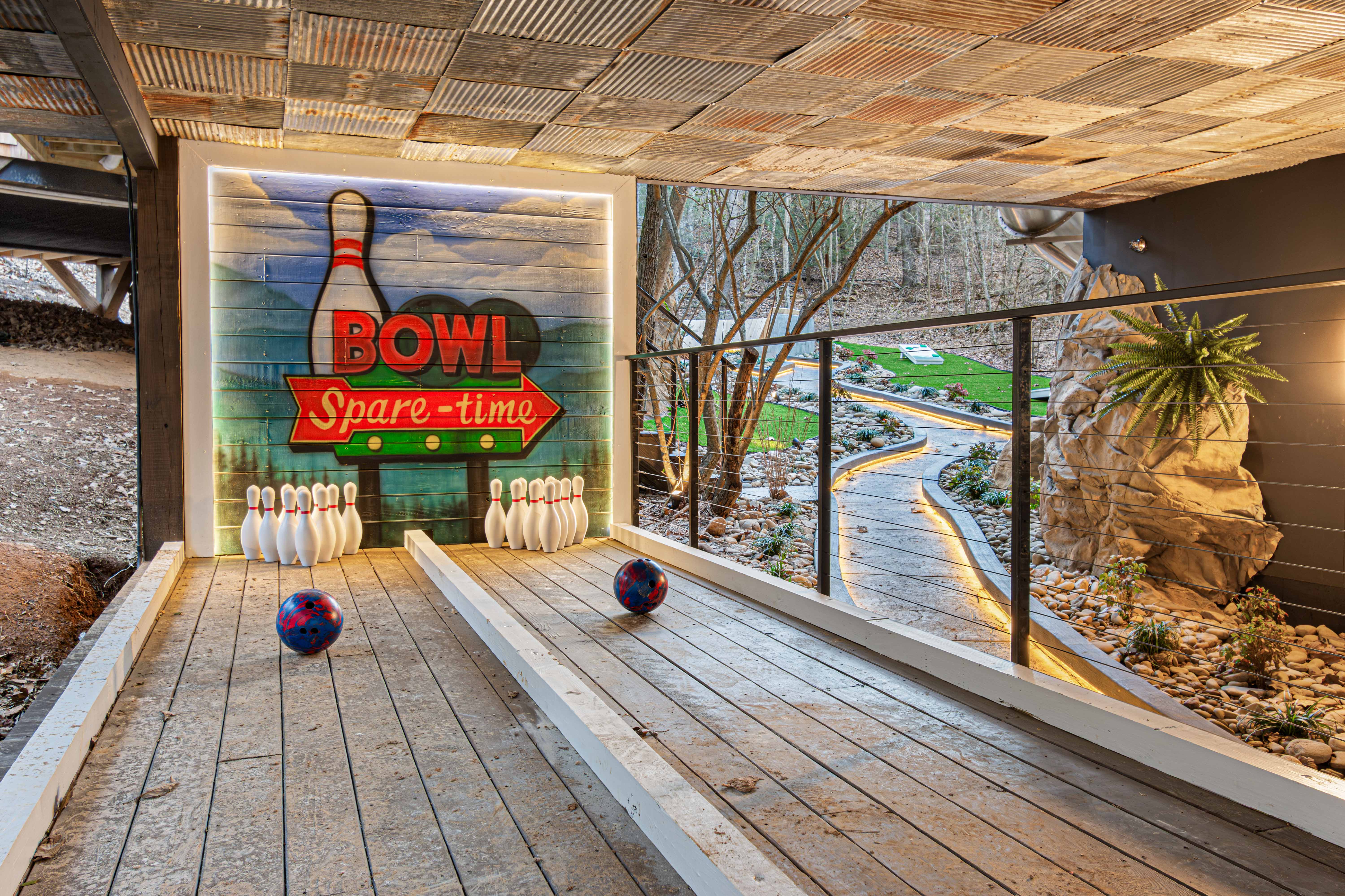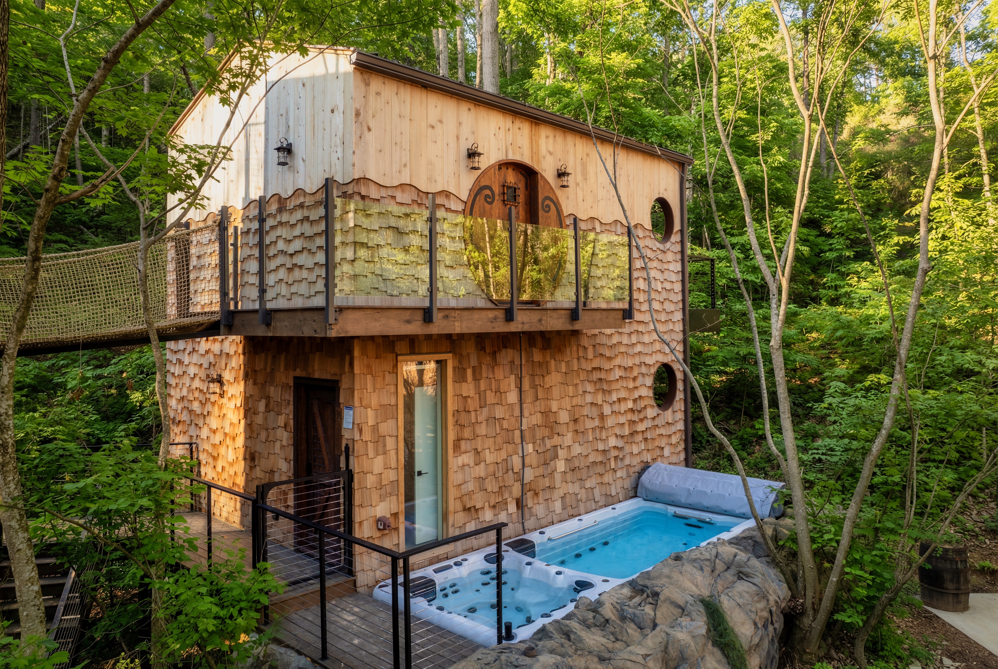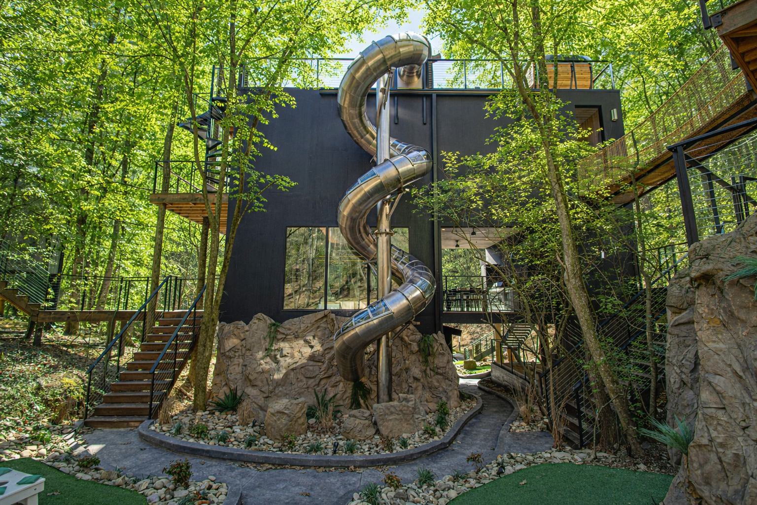 Escape to the Extraordinary at The Hideout Nestled in the Smoky Mountains, The Hideout is a four-story treetop retreat where luxury, adventure, and imagination converge. Spiral down a 37' tall glass slide into a glow-in-the-dark mini golf haven, cross suspended rope bridges linking cabins with panoramic forest views, and enjoy five curated luxury bedrooms, a swim spa, high end game room, outdoor bowling, sauna, sunken fire pit, yard games & more. Everything you need for an unforgettable escape!