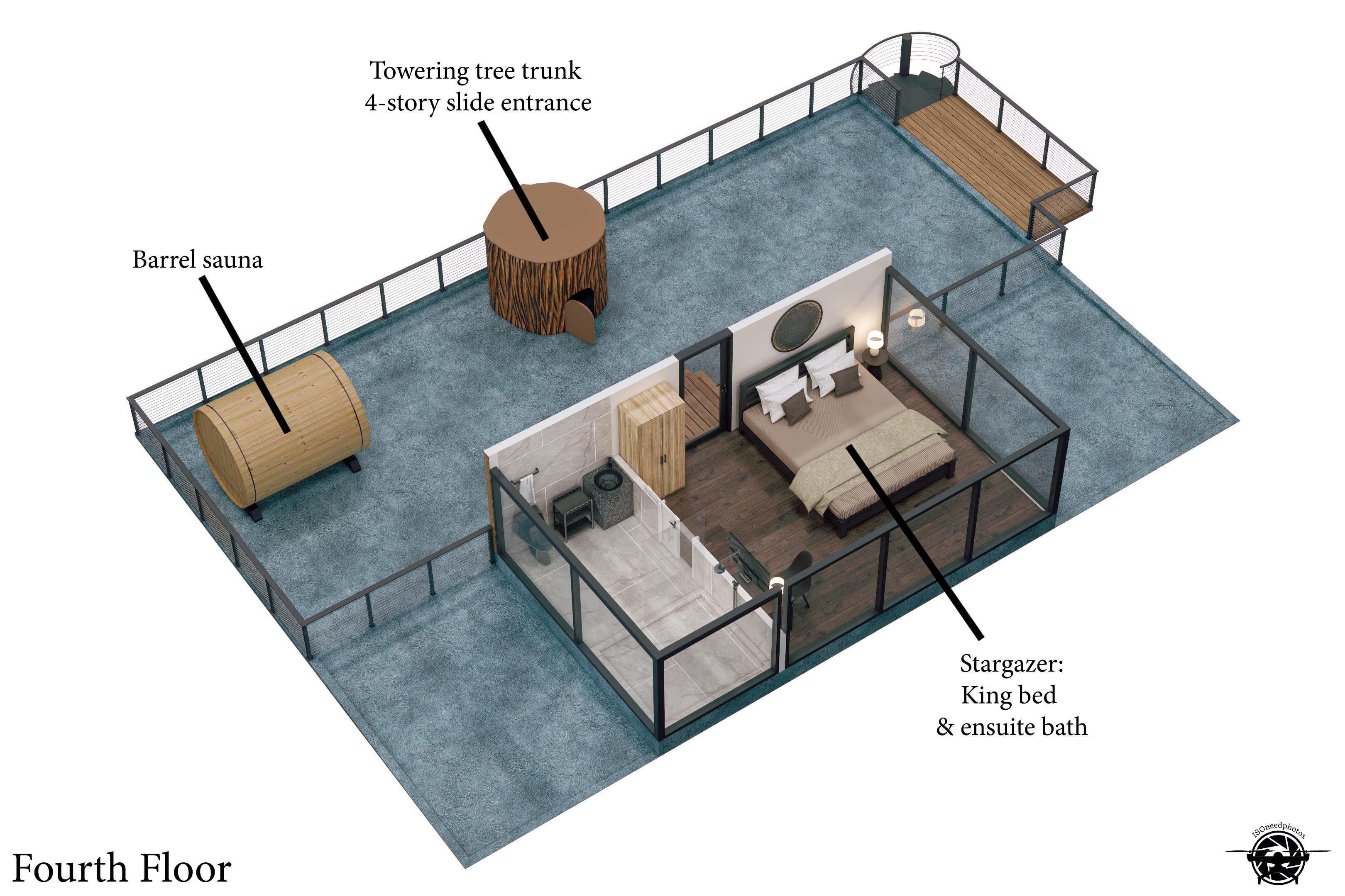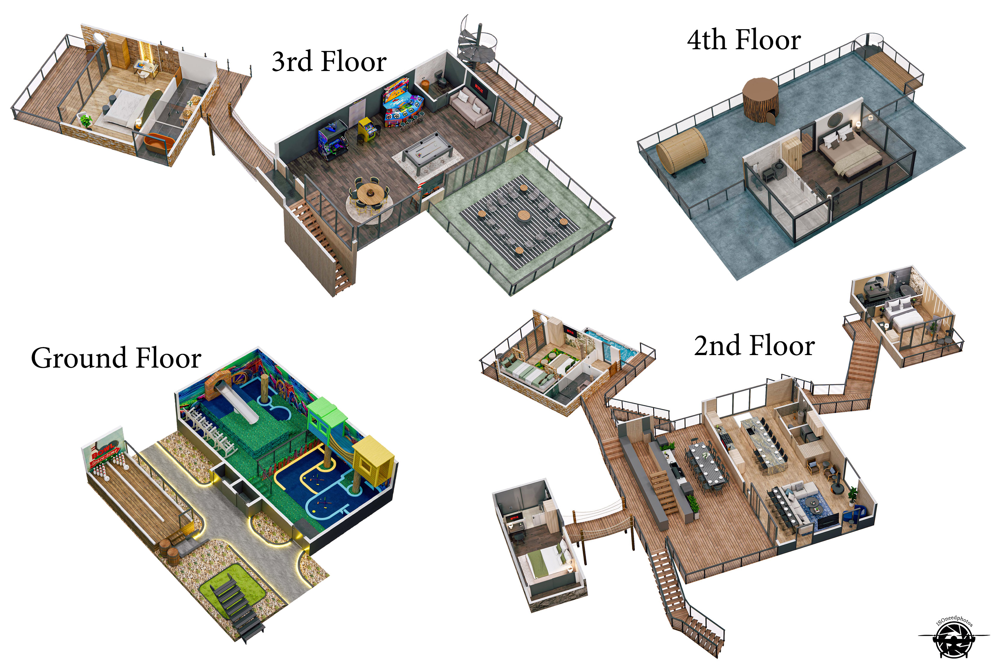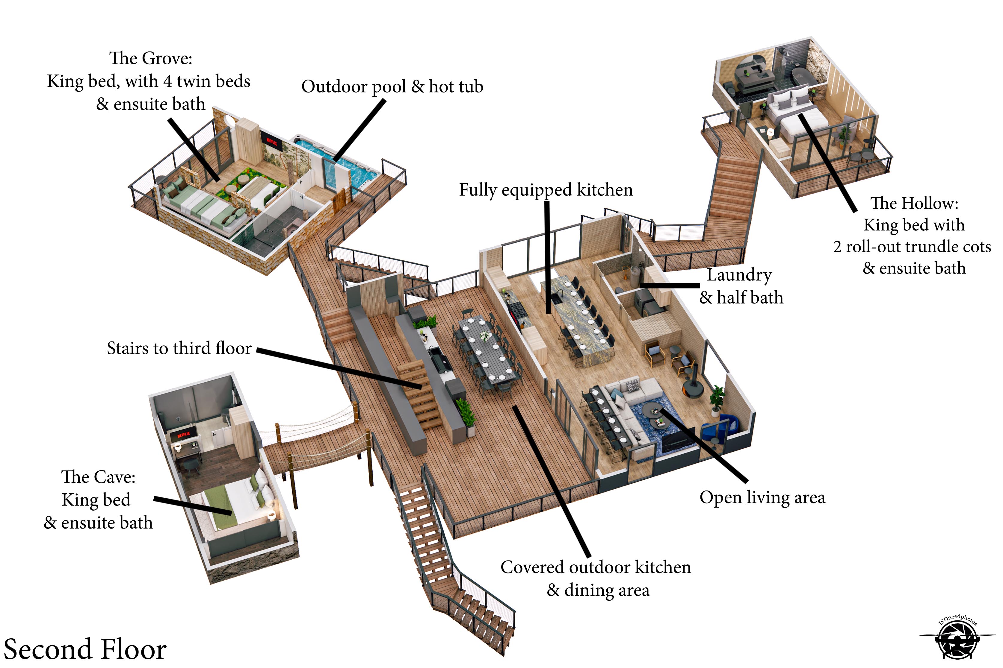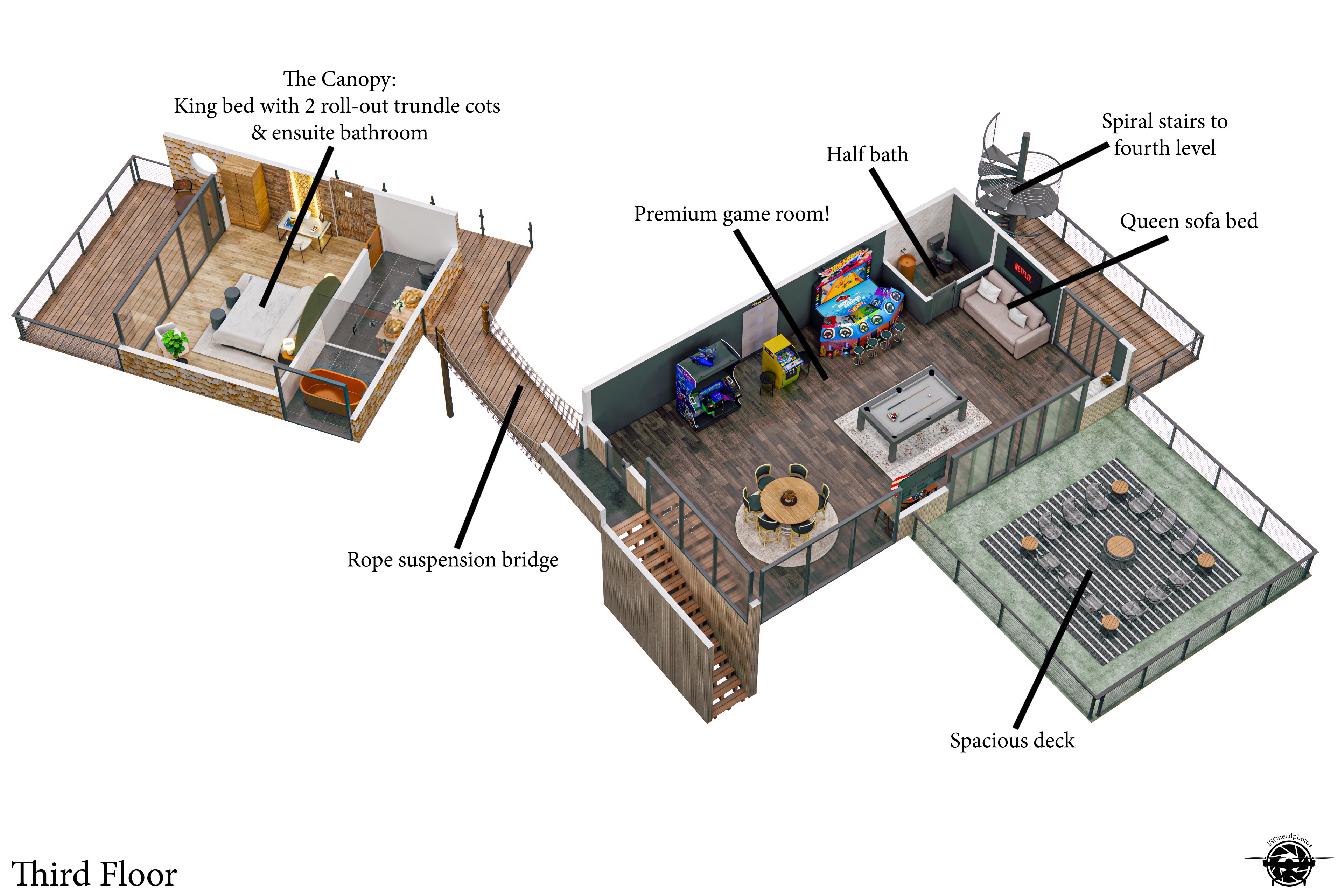 Escape to the Extraordinary at The Hideout. We are thrilled to welcome you to our newest, one-of-a-kind Smoky Mountain retreat. While this property is a fresh addition to our collection, we bring years of experience and a legacy of over 2,000 five-star reviews across the Smokies. Your stay here promises to be exceptional, seamless, and unforgettable. From the moment you arrive down the private driveway, you’ll know this is no ordinary getaway. The Hideout is a uniquely curated treetop experience, designed to delight at every turn. The main building features the glow-in-the-dark mini golf haven, living room, gourmet kitchen, outdoor kitchen, and an epic game room, all flowing together for both luxury and adventure. Spiral up to the fourth floor and discover breathtaking forest views, a giant tree stump entrance hiding a four-story glass spiral slide, a barrel sauna, and our mirror cabin with floor-to-ceiling panoramic forest vistas. Adventure and luxury are woven seamlessly into every detail. The property features five individually curated detached units, each with a private bedroom and ensuite bath, inspired by nature-luxury design. These units offer privacy, comfort, and a touch of magic, ideal for families or groups. Step outside to your resort-style backyard, designed to delight all ages, featuring a 20' swim spa (hot tub plus small pool), a massive sunken fire pit for evenings under the stars, barrel yard games including Plinko, ring toss, axe throwing, and skeeball, and a two-lane outdoor bowling alley. Guests also enjoy exclusive access to a one of a kind commercial grade glow-in-the-dark three-hole mini golf course. The main-level wraparound deck offers sweeping forest views, an outdoor kitchen with gas grill and pizza oven, and a dining table for 12. The perfect backdrop for meals with family or friends. From sunrise to starlight, every outdoor moment invites connection, laughter, and relaxation. Entertainment is thoughtfully woven into every level of The Hideout. The upper-level game room is like nothing you’ve ever experienced, featuring commercial-grade arcade games including 4 player Halo, the world's largest Pac-Man, and a four-person sit-down Nitro racing arcade, plus a poker table, pool table, and multicade barrel arcade with 150+ classic games. The fun continues downstairs with glow-in-the-dark mini golf and a kids treehouse adventure den. The kitchen serves as the heart of the home, fully equipped with a 48 inch, 8 burner stainless steel range and all cookware needed for everything from leisurely breakfasts to gourmet group dinners. A ten-person waterfall island and a six-seat bar table offer flexible seating, while a glass floor allows guests to watch the fun unfold as people finish the 4 story slide into the mini golf room below. Floor-to-ceiling windows frame the treetops and offer a perfect view of the four-story slide. The Hideout’s five individually curated units blend luxury, comfort, and forest inspiration. Each unit is connected to the main house through rope suspension bridges and elevated walkways that all provide guests with a bedroom and ensuite private bathroom. Stargazer on the fourth floor features a king suite, desk, and TV. The Hollow on the second floor offers a king suite with two trundle cots for children, a desk, and a private deck. The Cave on the second floor, includes a king suite, desk, and TV, accessed via a suspension rope bridge. The Grove on the second floor has a king bed plus four twin beds and a private deck. The Canopy on the third floor offers a king bed, two trundle cots for children, a desk, and a private deck with floating net. The Hideout is more than a vacation home. It’s a fully immersive, self-contained forest retreat. From treetop slides to glow-in-the-dark mini golf, rope bridges, mirrored cabins, and endless games. Everything you need is right here! Escape the ordinary, recharge, and create memories that will last a lifetime. All without ever leaving the property. ADDITIONAL AMENITIES – • Cozy 20' swim spa year round with 7 person hot tub and small swimming pool • 4 person Halo, World's Largest Pac Man, 4 seat racing arcade game, pool table, poker table, barrel arcade • High-speed Wi-Fi internet access • Washer and dryer available to use during your stay. • Heating & A/C • Parking for 8 standard-size vehicles. • We provide a set of starter supplies to allow you to get settled when you arrive. They include 2 trash bags, 2 dishwasher pods, a paper towel roll, a small liquid dish soap bottle, toilet paper, shampoo, conditioner, body lotion, body wash, and a soap bar for each bathroom, towels, a bed, and linens. They are designed so that you are all set when you arrive, but not to last the entire trip. • Less than 4 miles from downtown Gatlinburg, and access to all the area has to offer, which includes its great restaurants, shopping & the Smoky Mountain National Park. • Less than 3 Miles to Pigeon Forge & 7 miles away from the entrance to Dollywood/Splash Country! • Our proximity to the Great Smoky Mountain National Park means there is lots of wildlife in our area - black bears, deer, wild turkeys, raccoons, coyotes, foxes, and more! Black bears visit the cabin often in Spring, Summer, and Fall. You may get lucky and catch a glimpse of one of these residents while enjoying the view from the deck. We also contract regular monthly pest services, which treat all pests from multiple types of bugs, mice, etc. Despite our regular treatments, given the proximity of the cabin to the park, it is possible these pests can temporarily enter the cabin. We immediately respond and treat if anything comes up, and have found it is very rare to come across anything like this. PLEASE NOTE: This unique retreat requires the navigation of stairs to each & every space, a part of the treetop adventure. To reach the main level it involves 20 steps from the parking area. Our additional units are accessed via suspension rope b