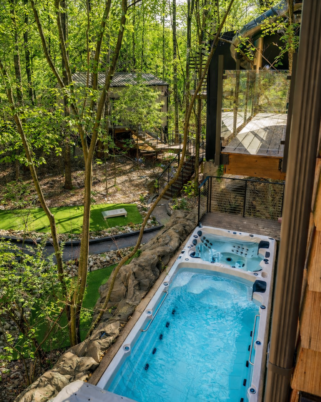 Nestled into the forest is your own swim spa! Part hot tub for 6 people and part swimming pool!
